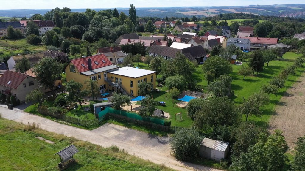 Das Haus ist von einem großen Garten mit Obstbäumen, einem kleinen Gemüsegarten und verschiedenen Spielgeräten umgeben. Durch die optimale Lage am Ortsrand – umgeben von Feldern und einem Wäldchen – bieten sich den Kindern umfangreiche Gelegenheiten des Lernens durch hautnahes Erleben sowie unzählige Bewegungsmöglichkeiten. Unsere Kinder sind es gewohnt und lieben es, viel Zeit an frischer Luft und in der Natur zu verbringen. Daher gibt es bei den Traumi- und Schlaubi-Schlümpfen einen wöchentlichen Waldtag. Aber auch unsere Jüngsten nutzen intensiv Zeit, um im Freien zu spielen und dort neue Erfahrungen zu sammeln.